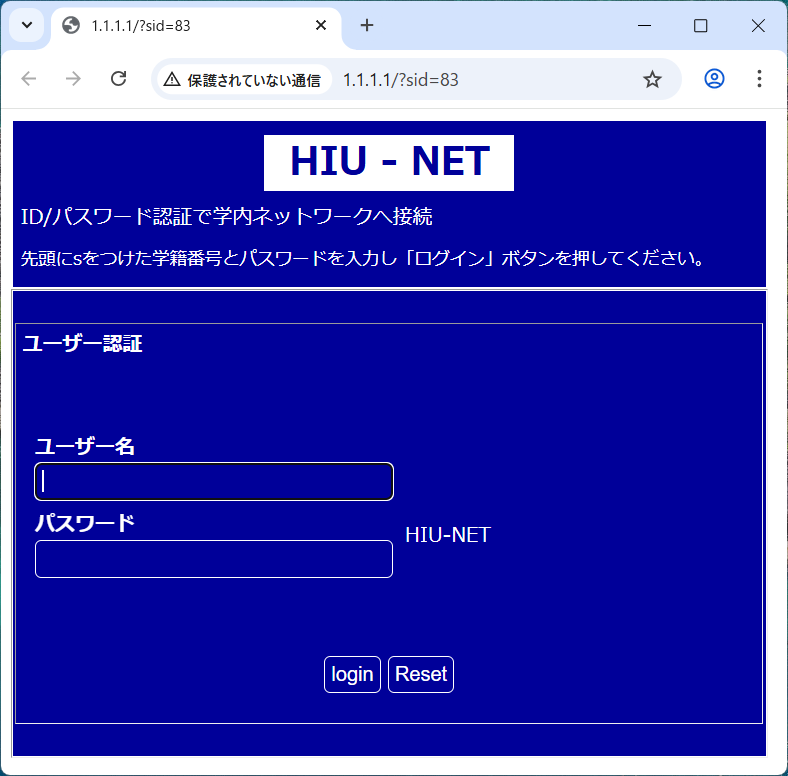 教室やゼミ室等からネットワーク接続を行おうとすると、以下のようなWeb認証画面が表示されます。