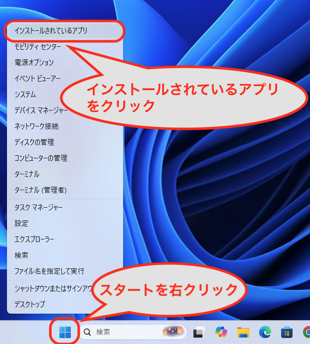 1.[スタートボタン]を右クリック → [インストールされているアプリ]を開きます。