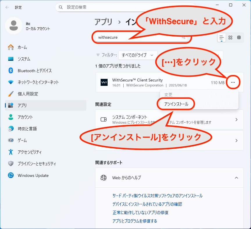 2.「WithSecure」で検索し、以下のアプリが見つかれば、「…」をクリックしてアンインストールをクリックします。